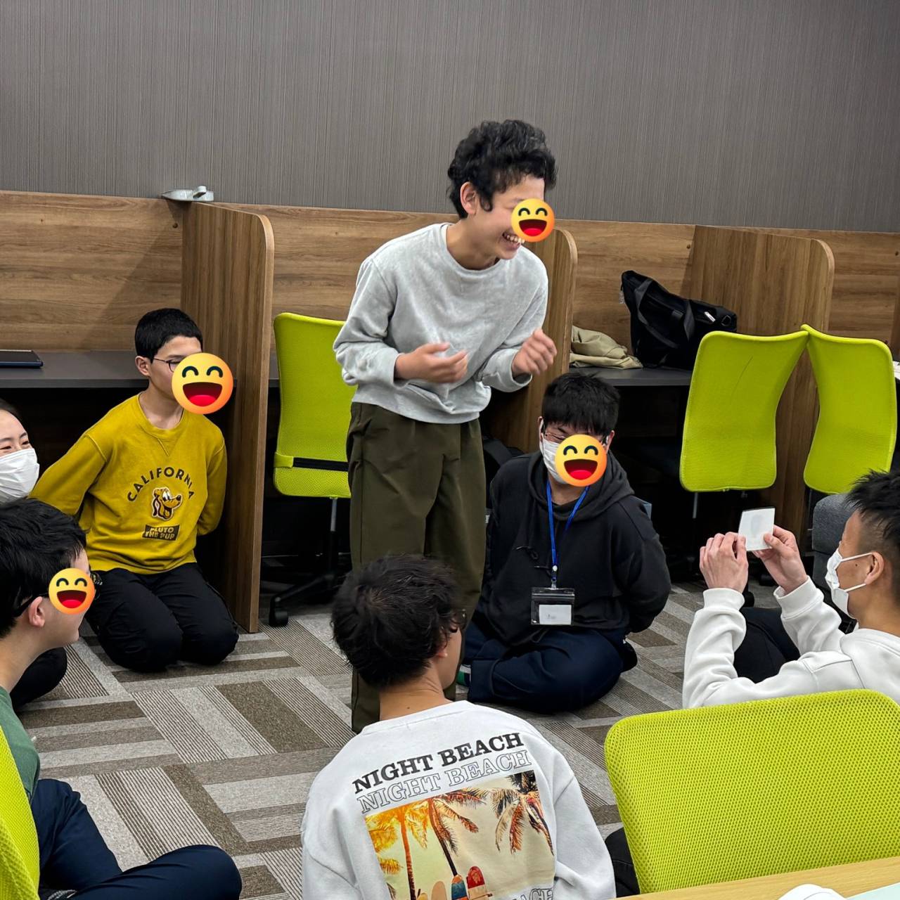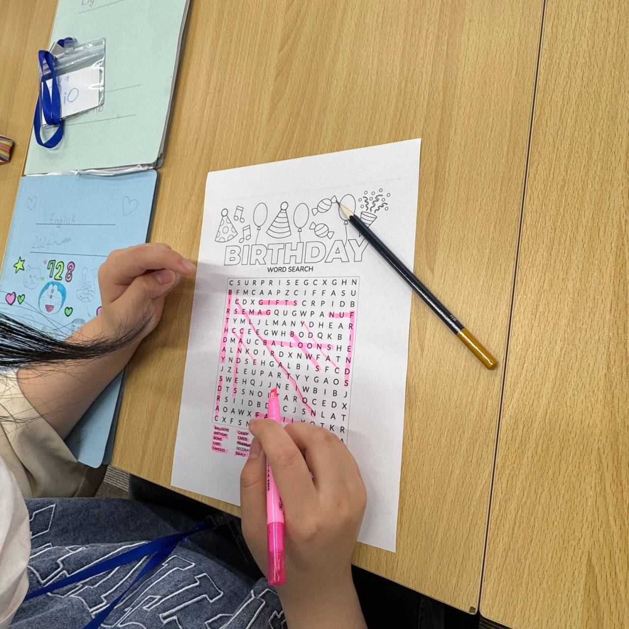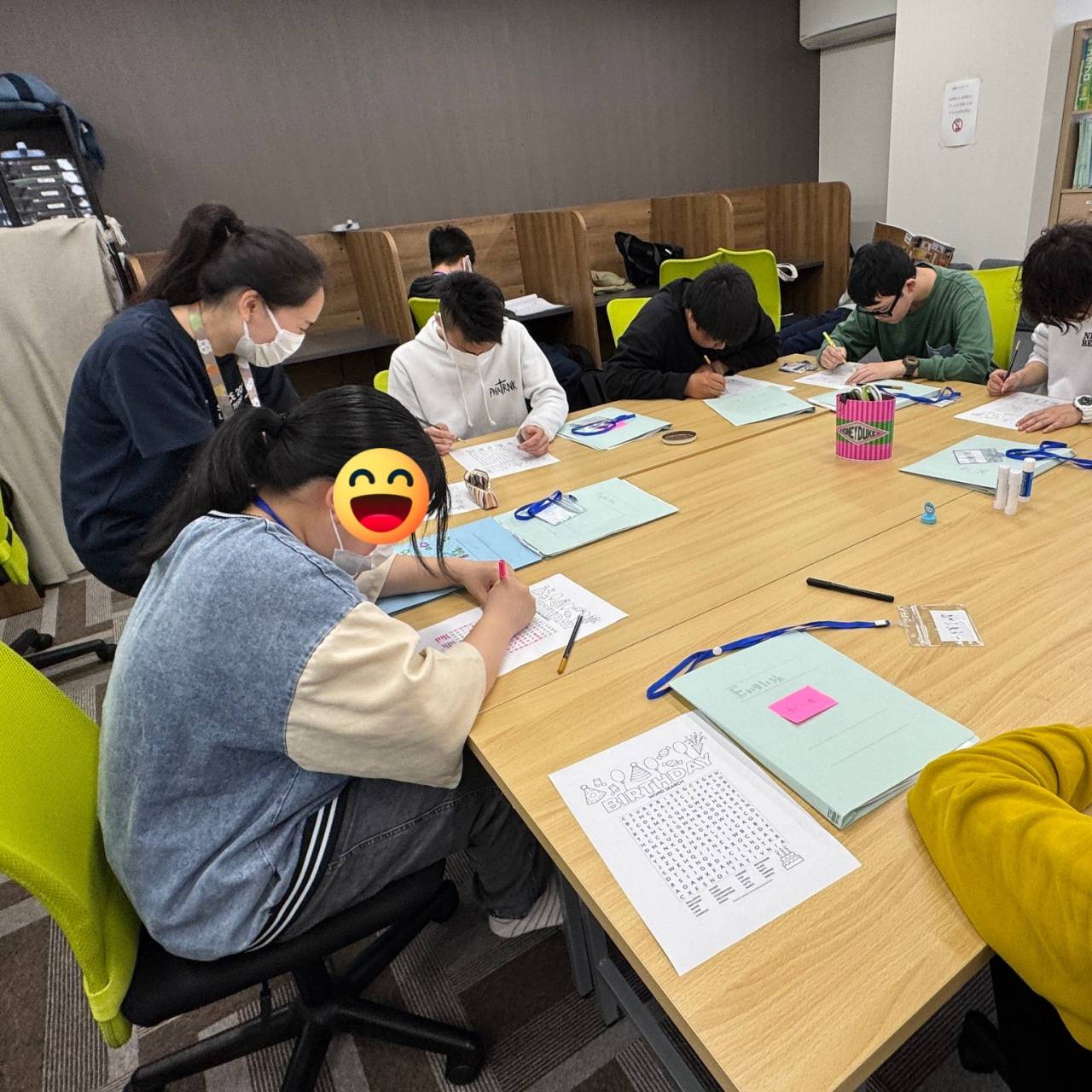 今回のワードサーチには “celebration”, “music”, “candles”, “balloons”, “happy” など、誕生日にまつわる英単語がたくさん隠されています。過去にも経験のある生徒たちでしたが、今回は少し難易度アップ。特に新入生にとっては初めてのチャレンジで、途中で苦戦する様子も見られました。