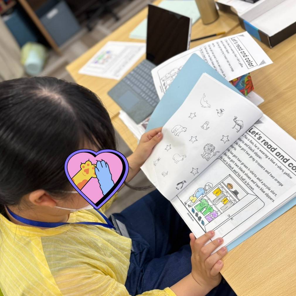 この日は英語の文章を読み取り、その内容に合わせて人物や持ち物に色を塗るワークを行いました。